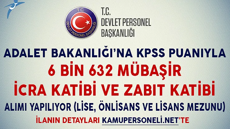 Adalet Bakanlığı tarafından yayımlanan ilana göre, bakanlık 527 Mübaşir, 4 bin 771 Zabıt Katibi ve 1344 İcra Katibi alımı yapacak.