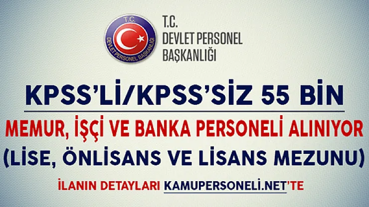 - KPSS'li/ KPSS'siz 55 Bin Memur, İşçi ve Banka Personeli Alımı Yapılıyor (Lise, Önlisans ve Lisans Mezunu)