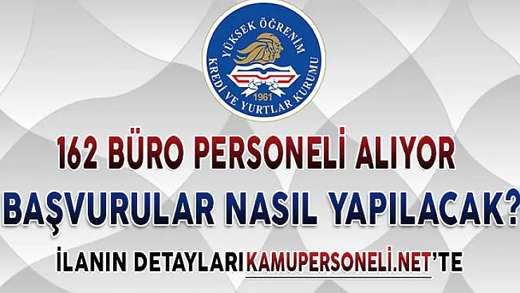 Kredi ve Yurtlar Kurumu tarafından geçtiğimiz günlerde Devlet Personel Başkanlığının resmi web adresi aracılığı ile bir ilan yayımlanmıştı. Yayımlanan ilanda Kredi ve Yurtlar Kurumunun 162 sözleşmeli büro personeli alımı yapacağı ifade edildi.