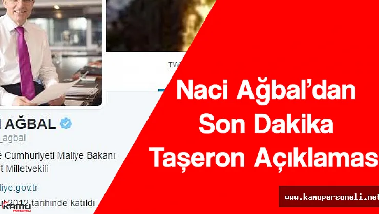 Türkiye Cumhuriyeti Maliye Bakanı Bayburt Milletvekili Naci Ağbal Sosyal Medya hesabı twitter üzerinden ' Basın Yayın organlarında yer alan bazı haber ve yorumlarda Taşeron çalışanlarının kamuya geçişine ilişkin çalışmaların durdurulduğu ve - yeni bir çal