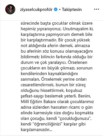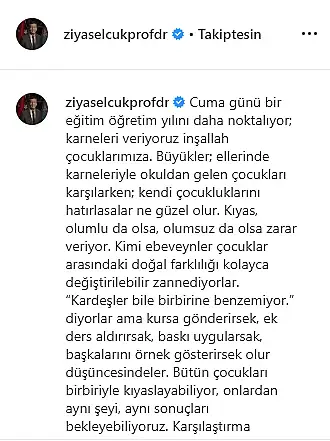 Milyonlarca öğrenci yarın karne heyecanını yaşayarak yaz tatiline girecek. Bakan Selçuk İnstaram hesabından yaptığı paylaşımda, ebeveylerin çocuklara nasıl yaklşaması gerektiğini başka çocuklarla kıyas yapılmamasına değindi. Selçuk, '' O gün elinde karnesiyle size doğru koşmakta olan çocuğu, kendi 'çocukluğunuzu' kendi 'öğrenciliğinizi karşılar gibi karşılamanızdır'' dedi.