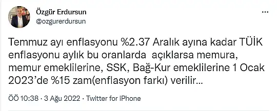 Erdursun, yaptığı paylaşımda, ‘’Temmuz ayı enflasyonu %2.37 Aralık ayına kadar TÜİK enflasyonu aylık bu oranlarda açıklarsa memura, memur emeklilerine, SSK, Bağ-Kur emeklilerine 1 Ocak 2023’de %15 zam(enflasyon farkı) verilir…’’ dedi.