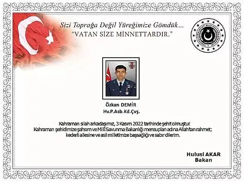 “"Kahraman şehidimize şahsım ve Milli Savunma Bakanlığı mensupları adına Allah'tan rahmet, kederli ailesine ve asil milletimize başsağlığı ve sabır dilerim"