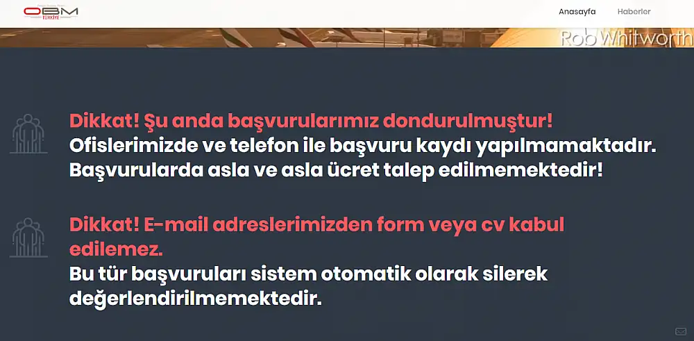 OBM TÜRKİYE'DEN YAPILAN AÇIKLAMA 'Dikkat! Şu anda başvurularımız dondurulmuştur! Ofislerimizde ve telefon ile başvuru kaydı yapılmamaktadır.Başvurularda asla ve asla ücret talep edilmemektedir! Dikkat! E-mail adreslerimizden form veya cv kabul edilemez.