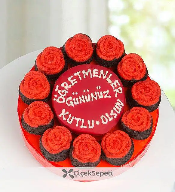Gül şekli verilmiş 11 adet kırmızı kakaolu kekten oluşan aranjman, tatlı bir sürprize hayır diyemeyecek tüm öğretmenler için mükemmel bir ‘