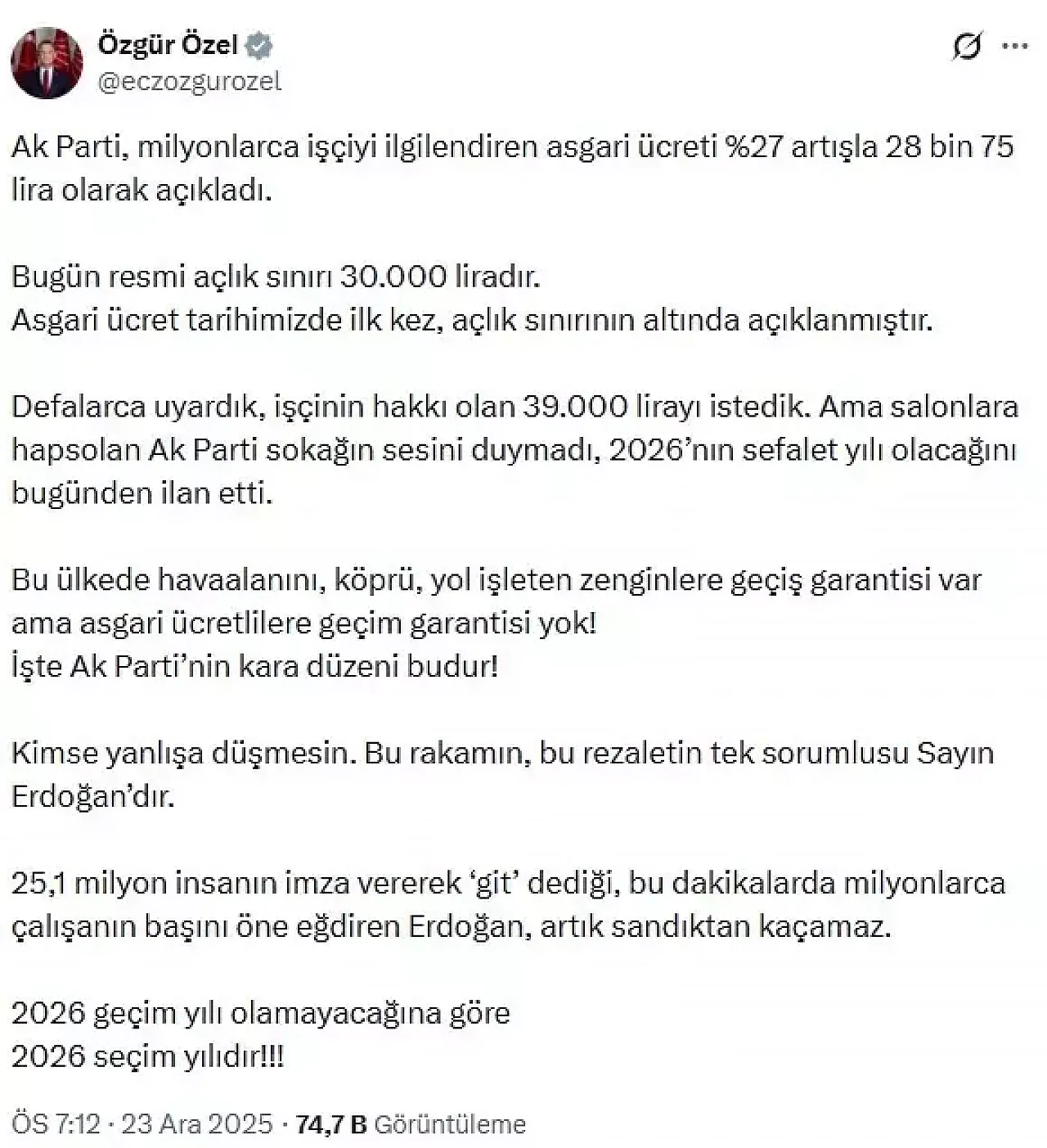 Cumhuriyet Halk Partisi (CHP) Genel Başkanı Özgür Özel, 2026 yılı için belirlenen 28 bin 75 liralık yeni asgari ücrete sert tepki gösterdi.
