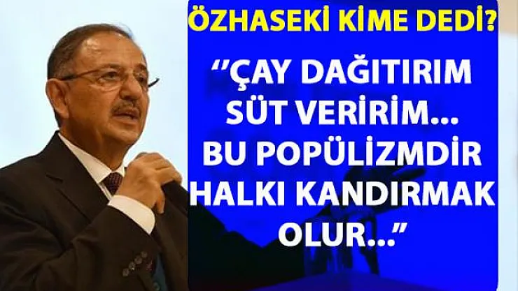 AKP Ankara Büyükşehir Belediye Başkan adayı Mehmet Özhaseki, dün yaptığı bir açıklamada popülizme dayalı söylemlere ilişkin bir takım açıklamalarda bulundu. Özhaseki yaptığı açıklamada, "Süt veririm, sabah da çay dağıtırım, paraları da şöyle düşürürüm, burayı da böyle keserim' diyorsanız, Allah yardım etsin bu şehre. Bu sadece popülizm, halkı kandırmak olur" dedi. Özhaseki'nin bu popülizm tanımı, ''Özhaseki, çay dağıtmanın halkı kandırmak olduğunu söyleyerek kimi ima etti?'' sorusunu akla getirdi.