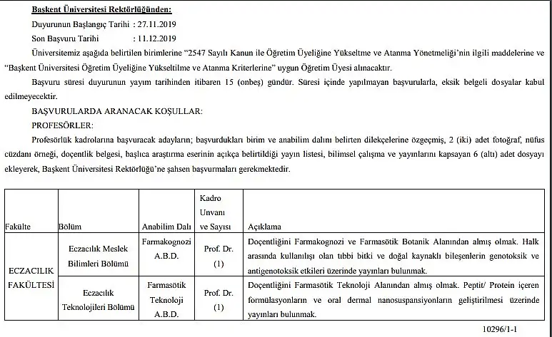 Yayınlanan personel alım ilanında, "Üniversitemiz aşağıda belirtilen birimlerine “2547 Sayılı Kanun ile Öğretim Üyeliğine Yükseltme ve Atanma Yönetmeliği’nin ilgili maddelerine ve “Başkent Üniversitesi Öğretim Üyeliğine Yükseltilme ve Atanma Kriterlerine” uygun Öğretim Üyesi alınacaktır. Başvuru süresi duyurunun yayım tarihinden itibaren 15 (onbeş) gündür. Süresi içinde yapılmayan başvurularla, eksik belgeli dosyalar kabul edilmeyecektir." denildi.