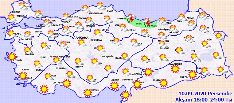 Hava Durumu: Parçalı az bulutlu, doğusu yer yer çok bulutlu, doğusu aralıklı gök gürültülü sağanak yağışlı; Rüzgar: Batı Karadeniz’de doğu ve kuzeydoğudan 4 ila 6 (30-50 km/sa km/sa); Doğu Karadeniz’de doğu ve kuzeydoğudan, sabah saatlerinde kuzeybatıdan 2 ila 4 (10-30 km/sa) batısı yer yer 5 (40 km/sa) kuvvetinde; Dalga: 0,5 ila 1,5 m, batısı yer yer 2,5 m; Görüş: İyi, yağış anında orta.