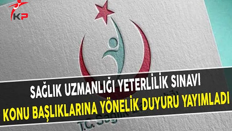 Sağlık Uzmanlığı Yeterlilik Sınavı Konu Başlıklarına Yönelik Duyuru Sağlık Bakanlığı'nın resmi internet sitesi üzerinden yayımlandı.Bununla beraber söz konusu duyuruda 46 konu başlığına yer verildiği görüldü.