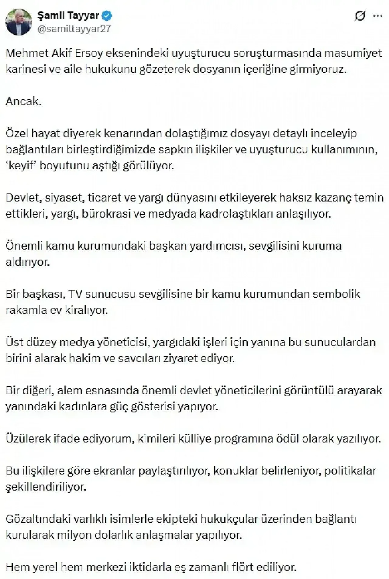Sosyal medya hesabından zehir zemberek açıklamalarda bulunan Tayyar, dosya derinlemesine incelendiğinde karşılaşılan tablonun korkunç olduğunu vurguladı. "Özel hayat" denilerek geçilemeyecek bir ağın kurulduğunu belirten Tayyar, uyuşturucu kullanımının sapkın ilişkilerle birleştiğini ve bu yapının devlet kademelerini kuşattığını iddia etti.