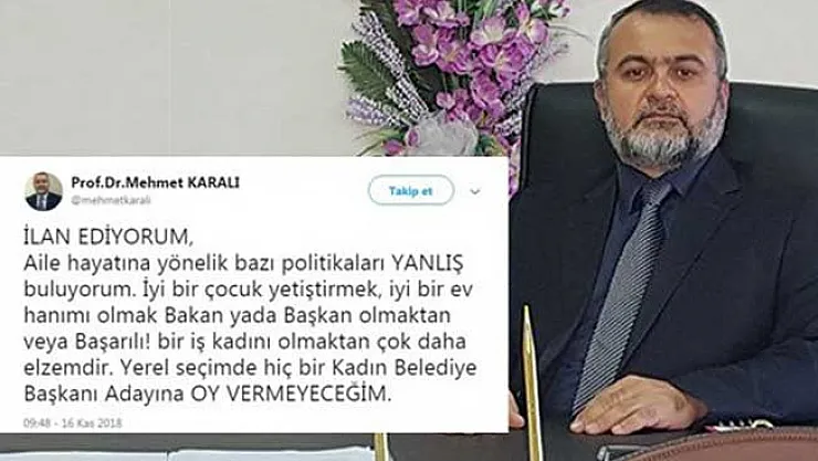 Yerel seçimde hiçbir kadın belediye başkanı adayına oy vermeyeceğim" ifadelerini kullandı. Dekan Karalı, gelen tepkiler üzerine, mesajı silerek,