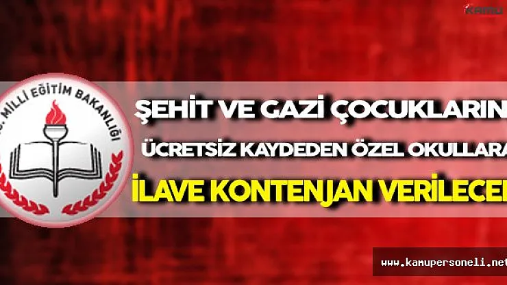 Milli Eğitim Bakanlığının resmi internet sitesinde bir açıklama yayımlandı.Yayımlanan açıklamada şehit ve gazi çocuklarını ücretsiz kaydeden özel okullara ilave kontenjan verileceği belirtildi.