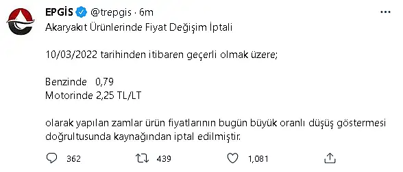 EPGİS Twitter üzerinden yaptığı açıklamasında bu geceden itibaren benzine 0,79 TL, motorine ise 2,25 TL'lik zammın ,"Büyük oranlı düşüş göstermesi sebebi ile" iptal edildiğini duyurdu.