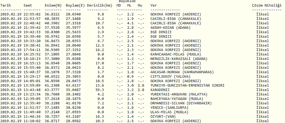 19 ŞUBAT 2019 TARİHLİ SON DEPREMLER LİSTESİ