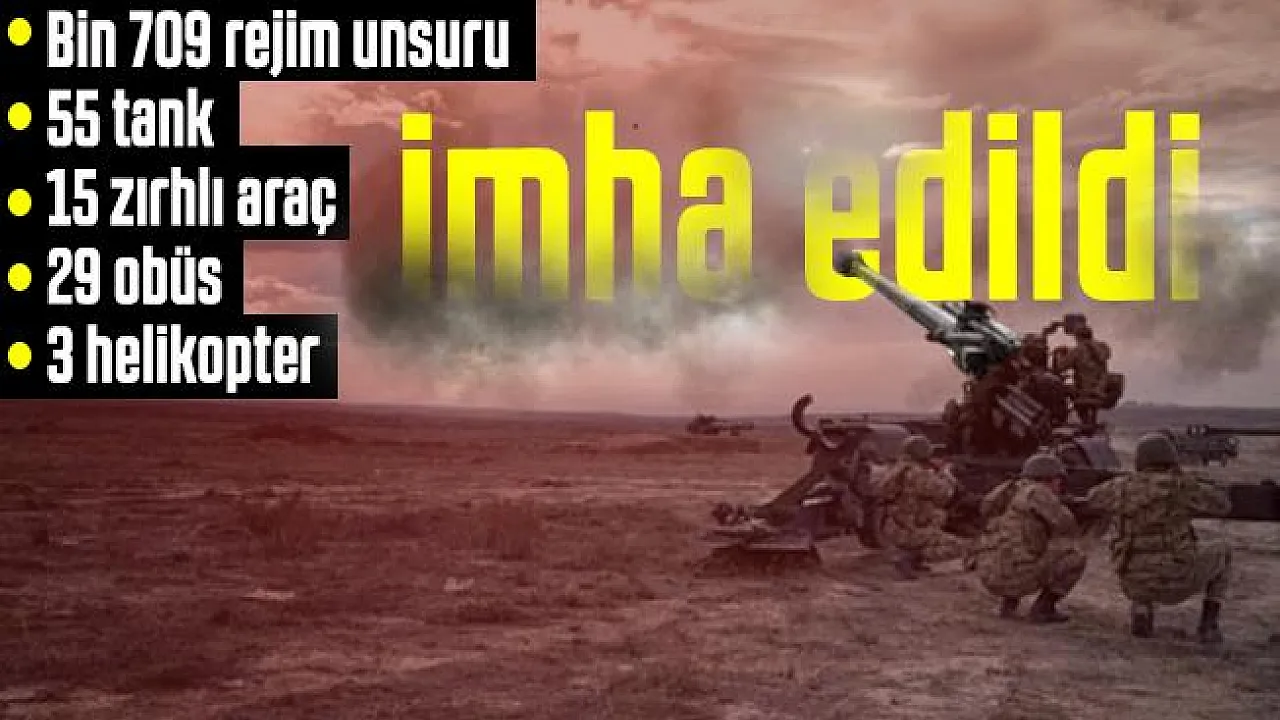 Son dakika gelen bilgilere göre Türk ordusu tarafından İdlib'de bin 709 rejim unsuru, 55 tank, 15 zırhlı araç, 29 obüs ve 3 helikopter imha edildi.