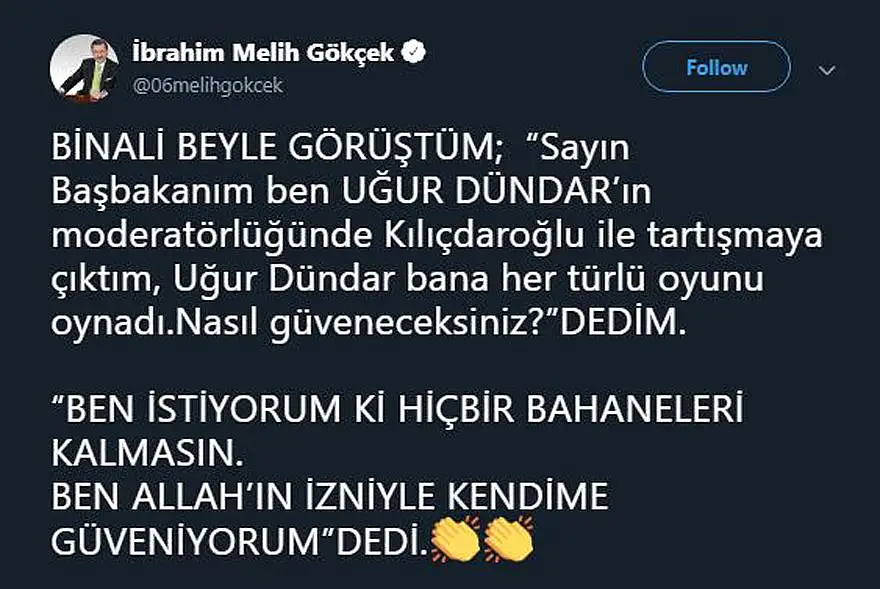 Ankara'nın eski Büyükşehir Belediye Başkanı Melih Gökçek, sosyal medya hesabından açıklamalarda bulundu.AKP'li Binali Yıldırım Ekrem İmamoğlu ile bir araya geleceği programı duayen gazeteci Uğur Dündar'ın sunmasını istemesiyle ilgili Yıldırım'la görüştüğü