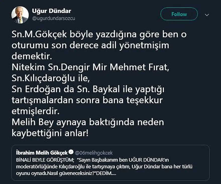 Gökçek’in yazdığı bu mesaja duayen gazeteci Uğur Dündar’dan cevap gecikmedi. Gökçek’i etiketleyen Dündar,;