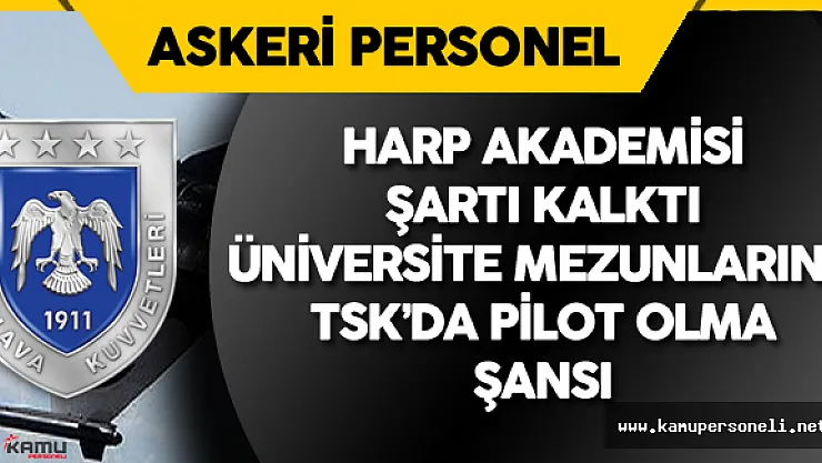 4 Yıllık eğitim veren fakülte ya da yüksekokullardan pilot ünvanı ile mezun olan kadın veya erkekler Hava Kuvvetleri Komutanlığı'na pilot alımı için başvuruda bulunabilecek.Harp Akademisi mezuniyeti şartı kaldırıldı.