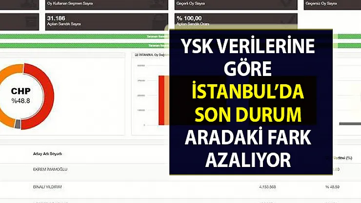 YSK’dan alınan verilere göre yüzde 49,4’ü sayılan oyların dağılımına göre Ekrem İmamoğlu 4.171.501, Binali Yıldırım 4.153.582 oy almış görünüyor. Bu sonuçlara göre aradki fark 17 bin 919 olarak belirlendi. Bu durumda oy farkı sadece 633 azalmış oldu.